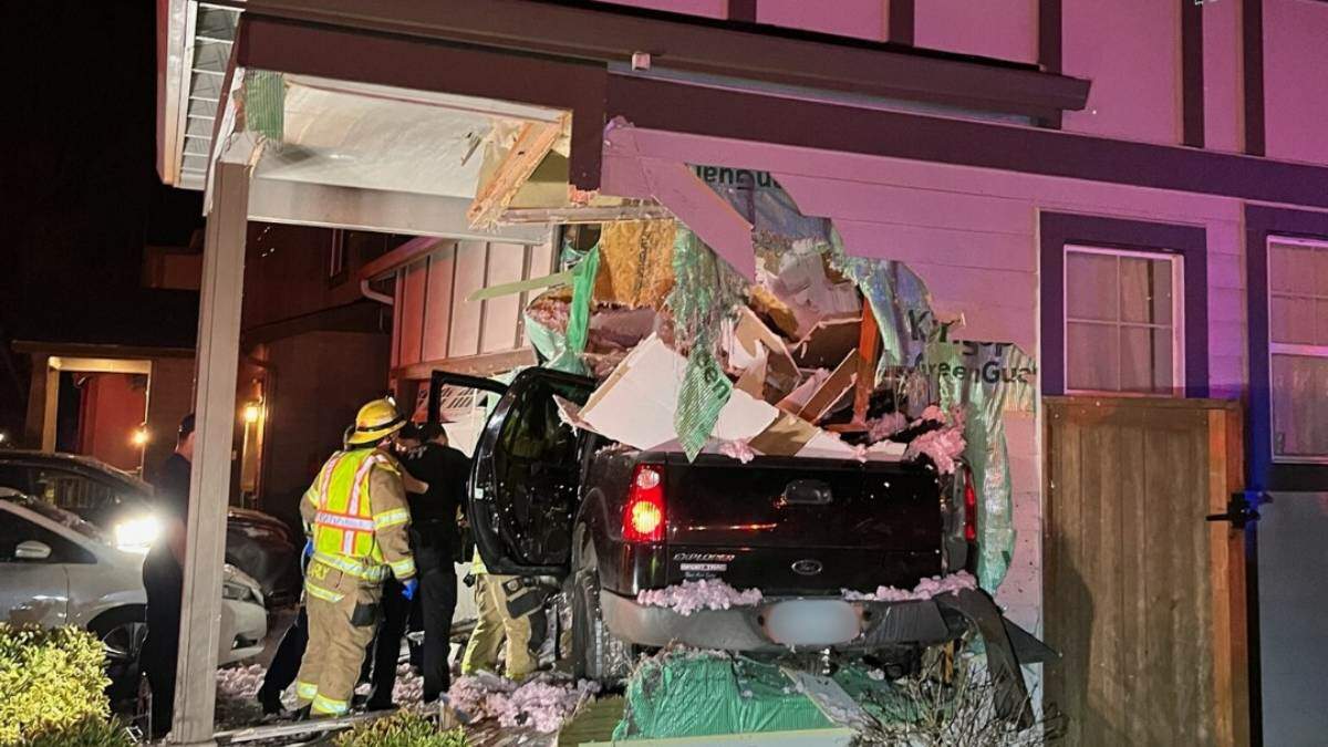 A dramatic video has captured the moment a pickup truck flew through the air and crashed into a family’s home in Tigard, Oregon, just outside Portland.