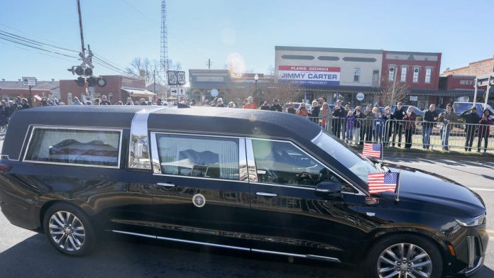 The state funeral for former President Jimmy Carter began on Saturday (January 4) in Georgia, marking the start of a six-day tribute to the 39th U.S. president. The ceremony commenced at Phoebe Sumter Medical Center in Americus, where Carter’s flag-draped casket was loaded into a hearse by former Secret Service agents. The motorcade then traveled through Carter’s hometown of Plains, Georgia, passing significant landmarks from his life, including his boyhood home and the family peanut warehouse.