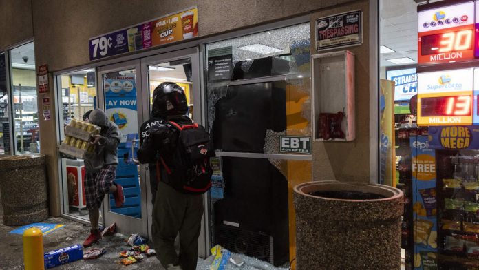 Following a fourth day of protests against immigration raids, several businesses in Los Angeles were looted and vandalized overnight. The protests are in response to increased Immigration and Customs Enforcement (ICE) raids in the area. Cleanup efforts were underway Tuesday morning at the Apple Tower Theatre on West 8th Street and Broadway, where looters broke in and stole multiple iPhones, Apple Watches, laptops, and chargers. “No ICE” was spray-painted on the store’s damaged glass windows, according to KTLA.