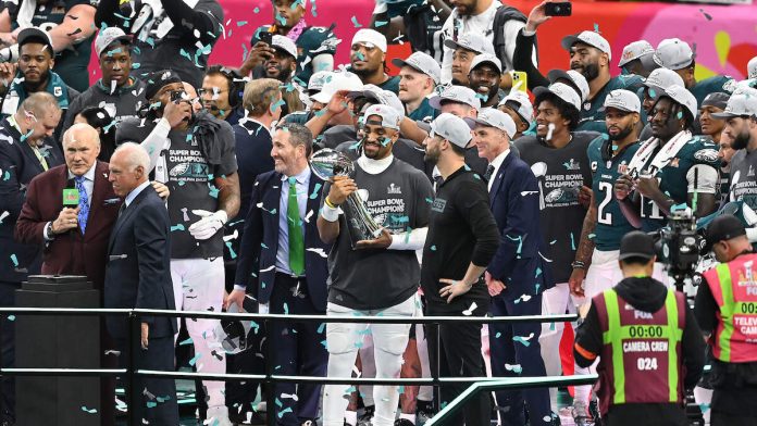 The Eagles are now two-time Super Bowl champions, having won Super Bowl LII in 2018 and made five appearances, which included a loss to the Chiefs two years prior in Super Bowl LVII.
